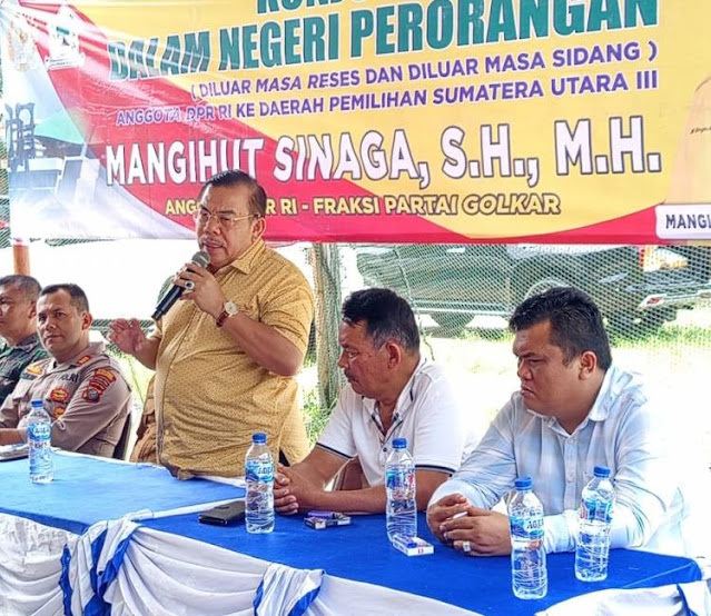 Parapat-Anggota DPR RI Komisi III - MPR RI Fraksi Partai Golkar dari Dapil Sumut III, Mangihut Sinaga, S.H, M.H melakukan kunjungan kerja (Kunker) ke Kota parapat untuk mendengarkan Aspirasi Masyarakat, yang diselenggarakan , Jalan.anggarajim , Kelurahan Parapat , Kecamatan Girsang Sipangan Bolon, Parapat, Kabupaten Simalungun, Selasa (15/04/2025)